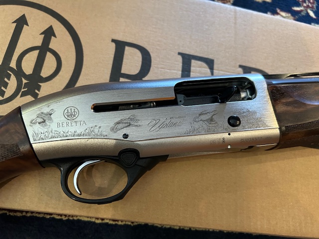 Beretta “NEW” A-400 Upland 20ga. 28″ field auto shotgun. This is Beretta’s newest A-400 Upland features a flat rib, new silver colored receiver with game scenes on sides, new KO system on the stock to reduce recoil, factory flush screw in chokes, and comes with all the accessories. Please give us a call with any questions and for best pricing.